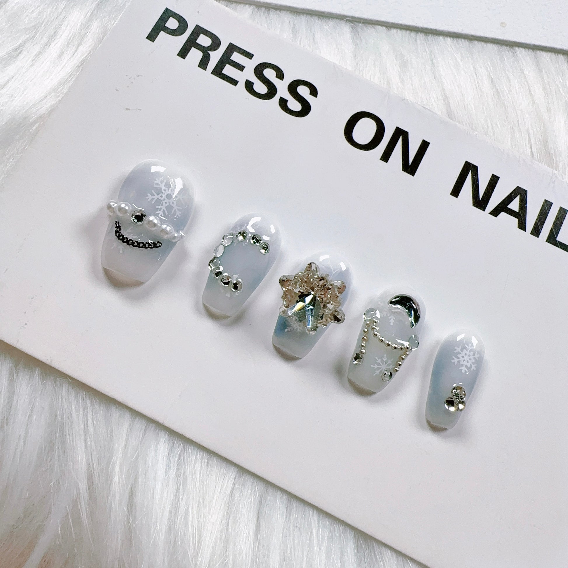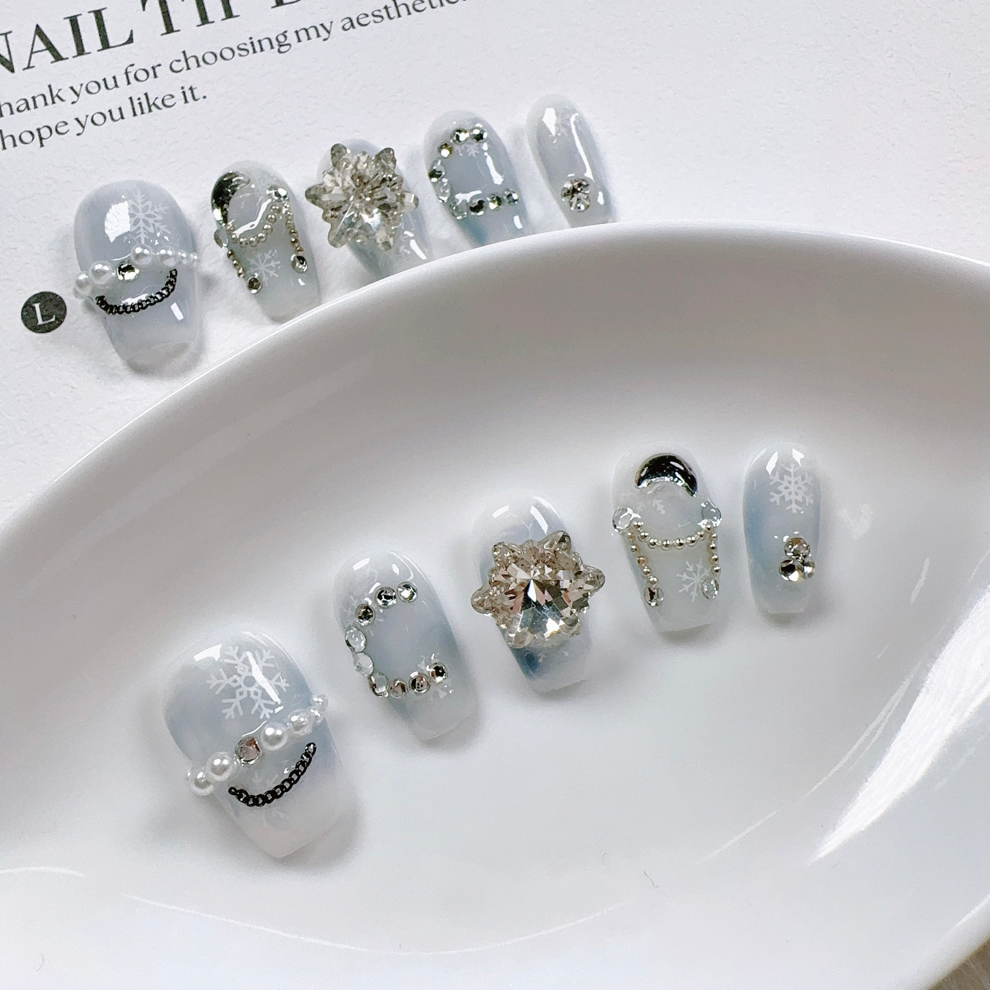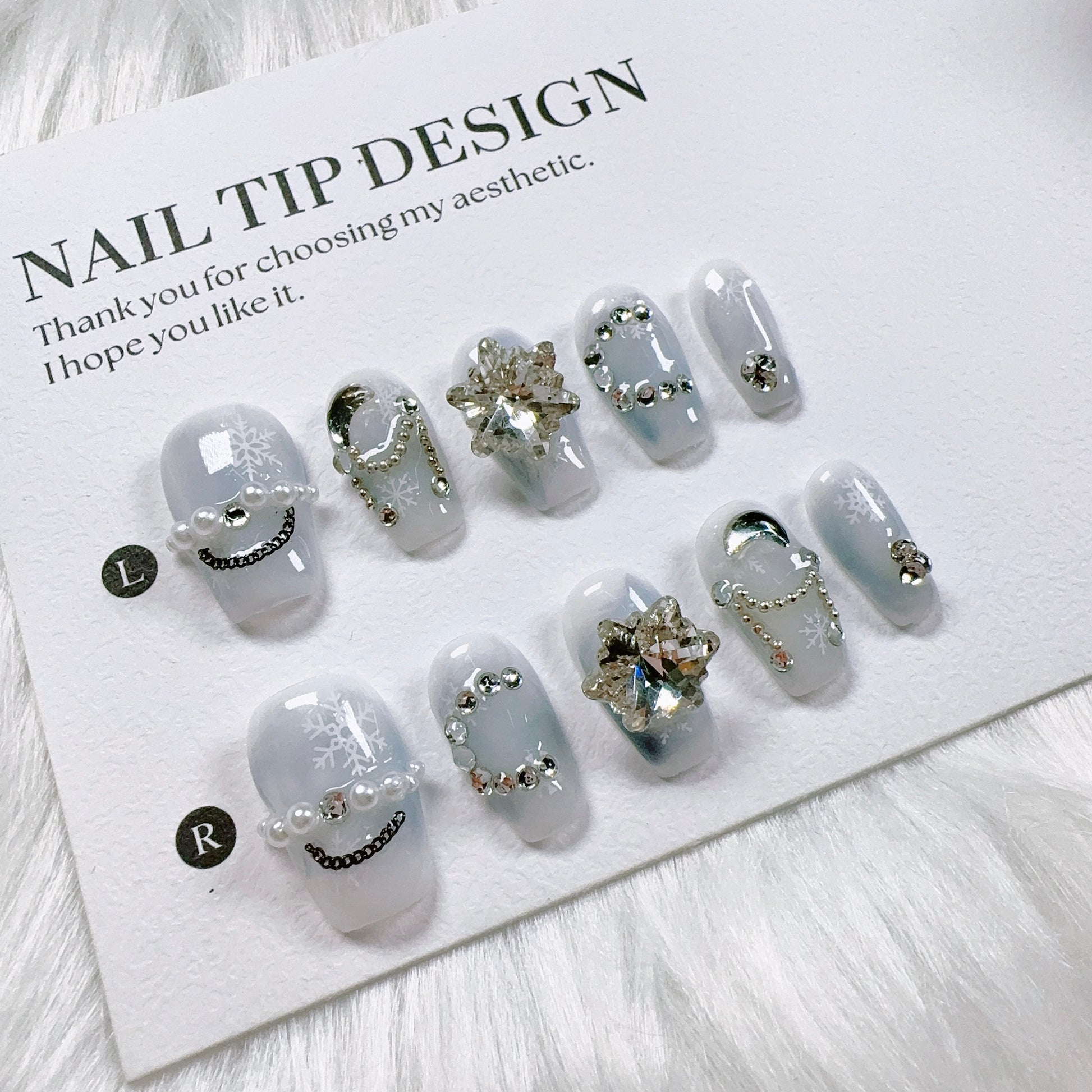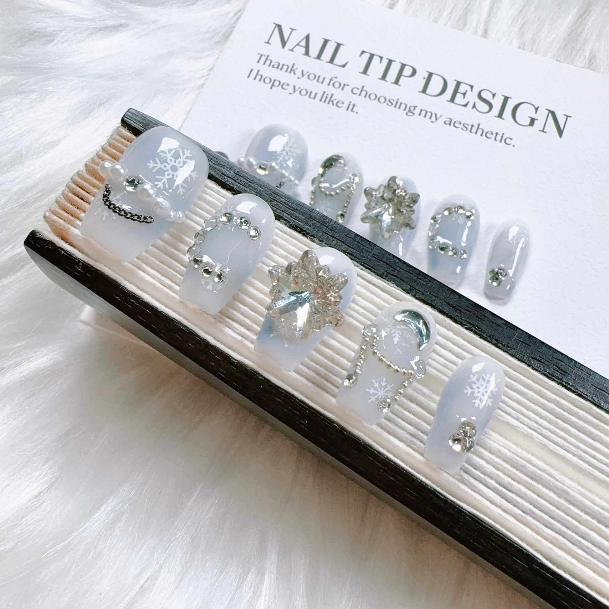 Experience the elegance of winter with the First Snow press-on nail set. Featuring a soft icy white and pale silver-blue base, these nails capture the serene beauty of a snow-covered landscape. Delicate snowflake motifs and curved metallic decals add refined detail, while tiny pearls, metallic chains, and crystal rhinestones—including oversized 3D star-shaped gems—offer a festive sparkle. Finished with a glossy top coat, this set delivers a sophisticated, multidimensional look perfect for celebrating the holiday season with expert style.