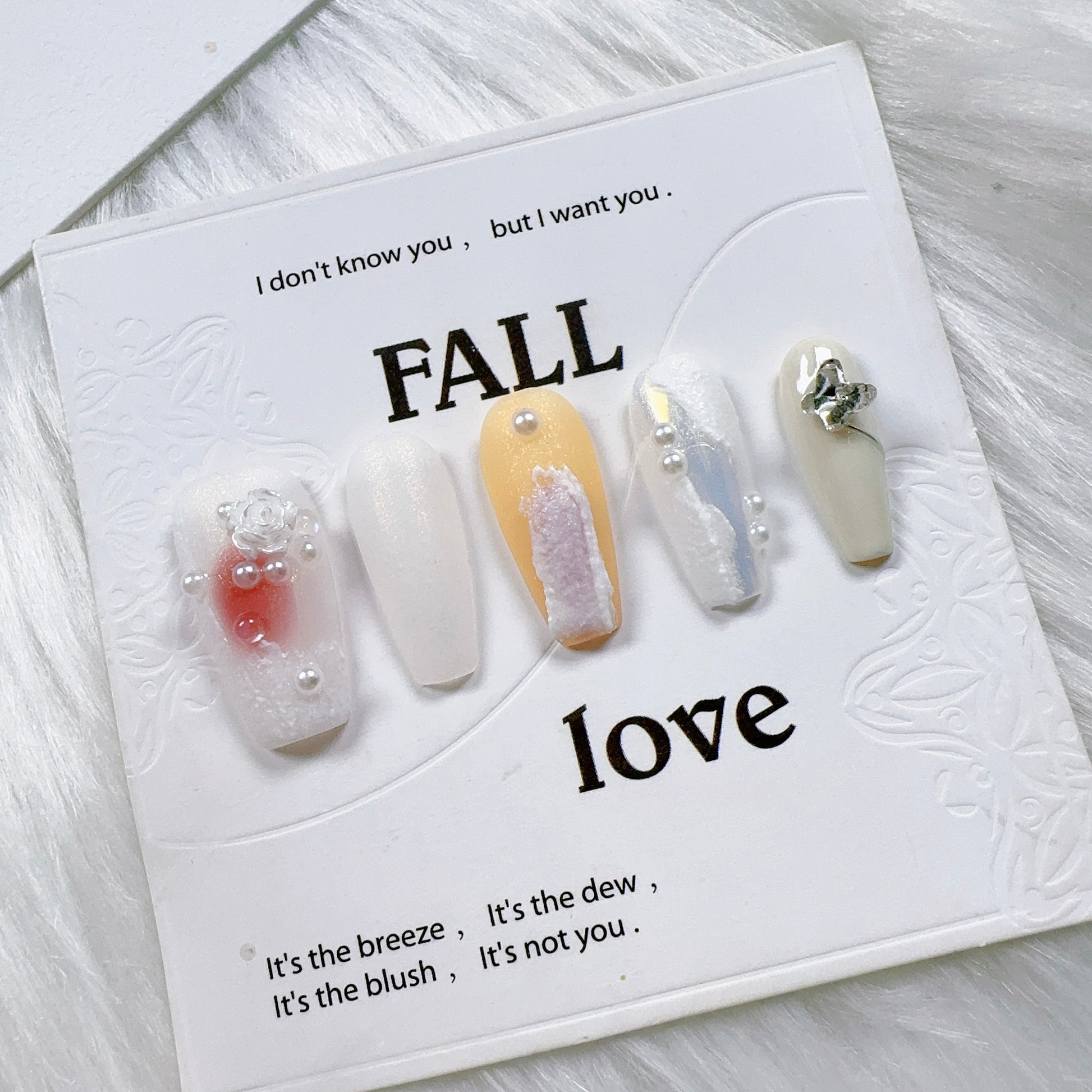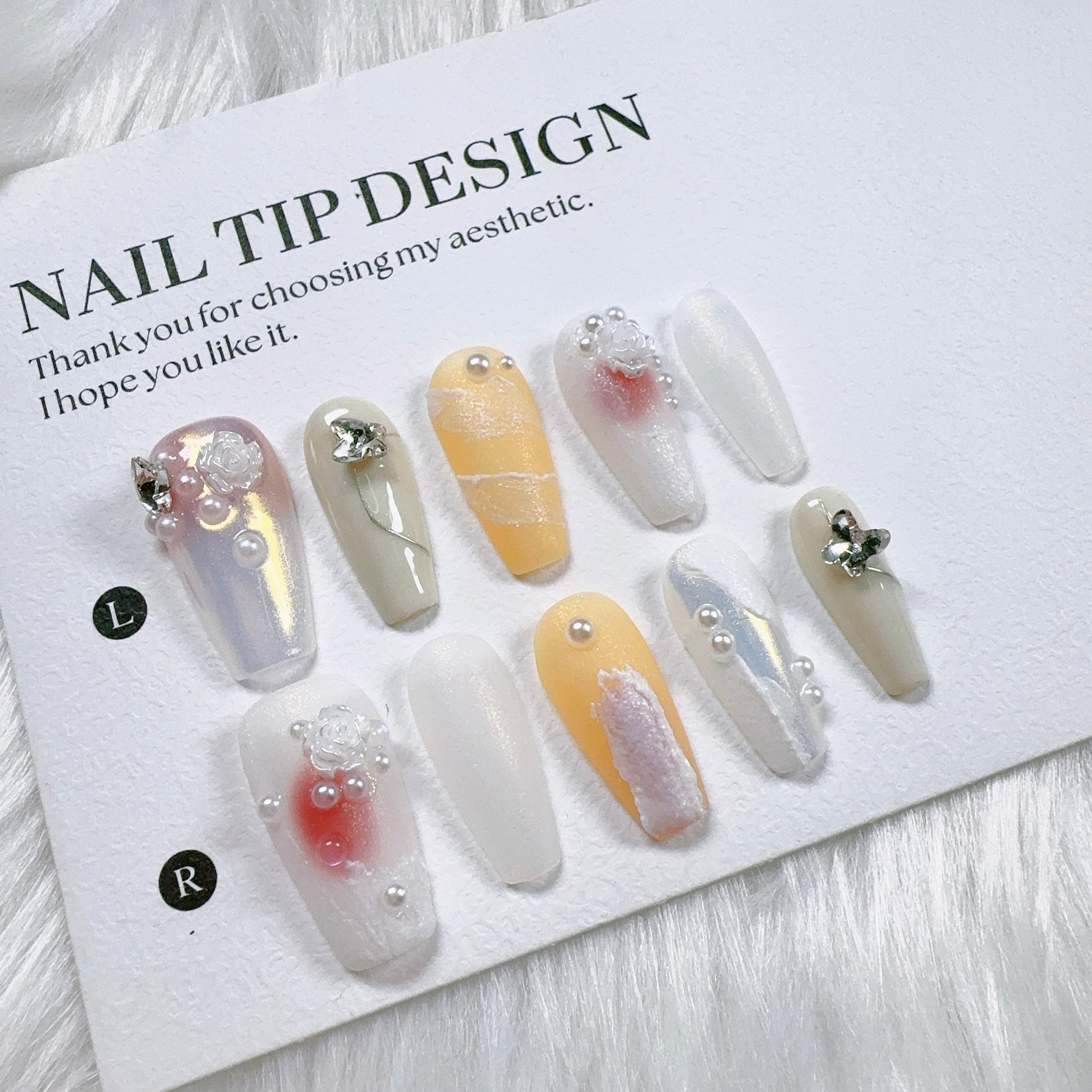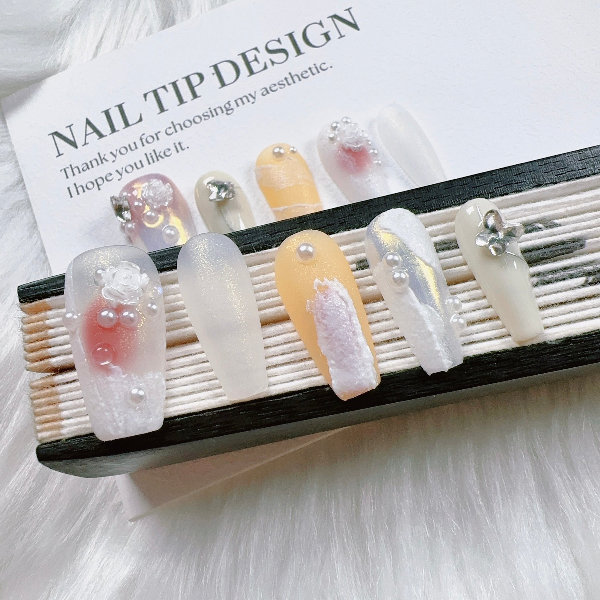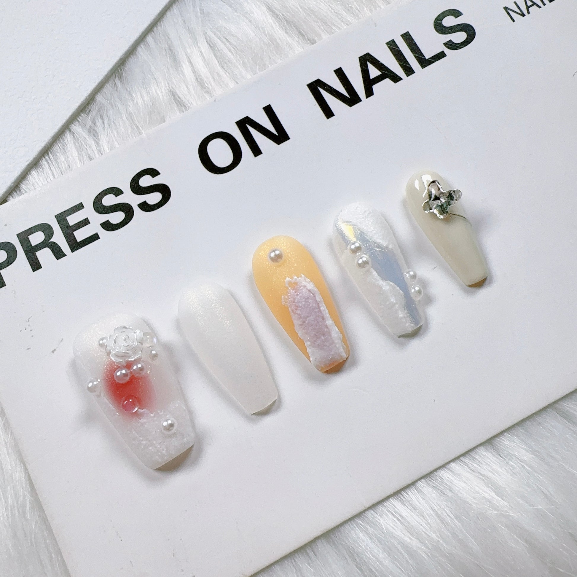 This is a soft and artistic set of handmade press-on nails, featuring a dreamy blend of muted pastels, delicate pearls, and sculptural textures. Each nail is uniquely designed with a touch of whimsy, making this set perfect for someone who appreciates modern minimalism with an abstract twist.