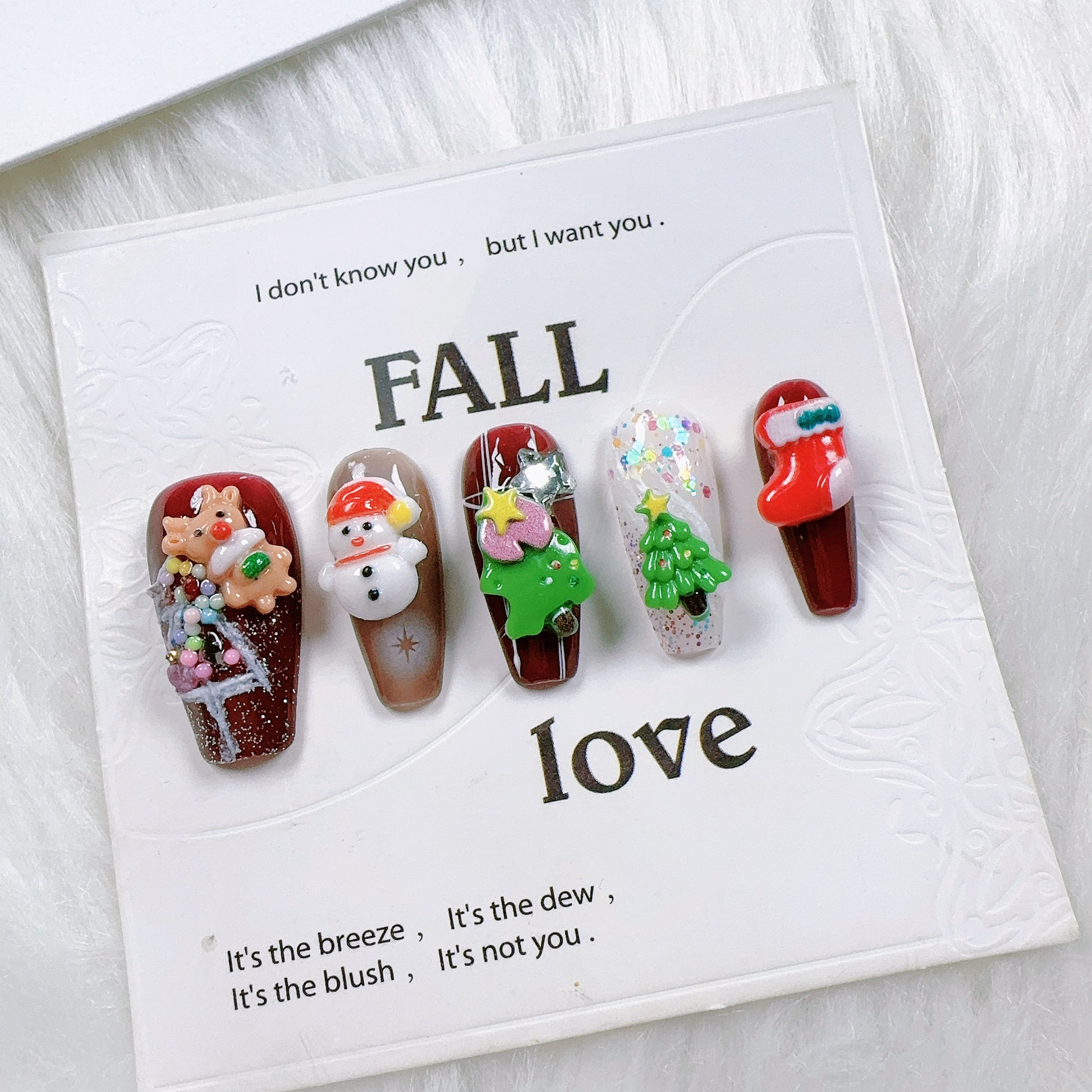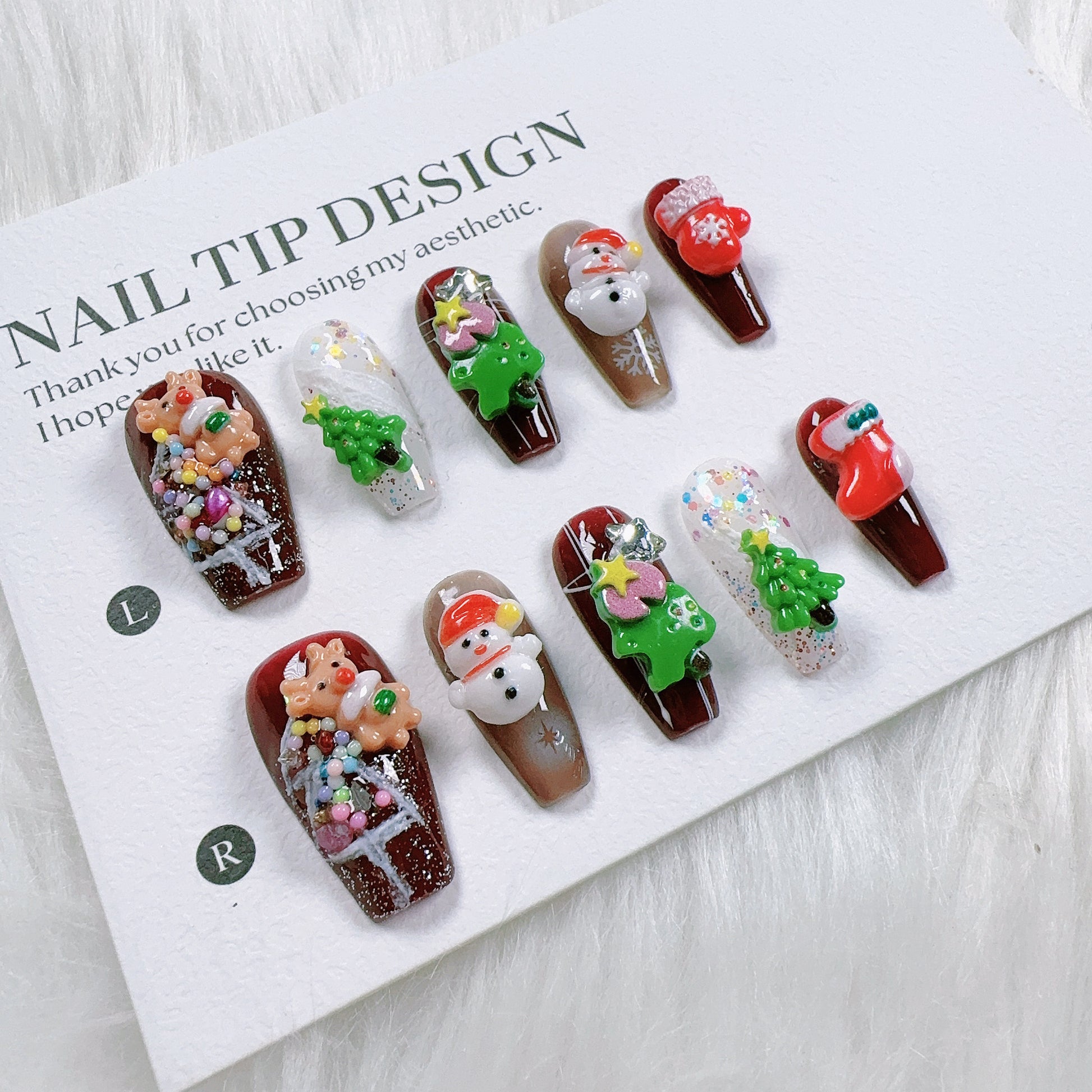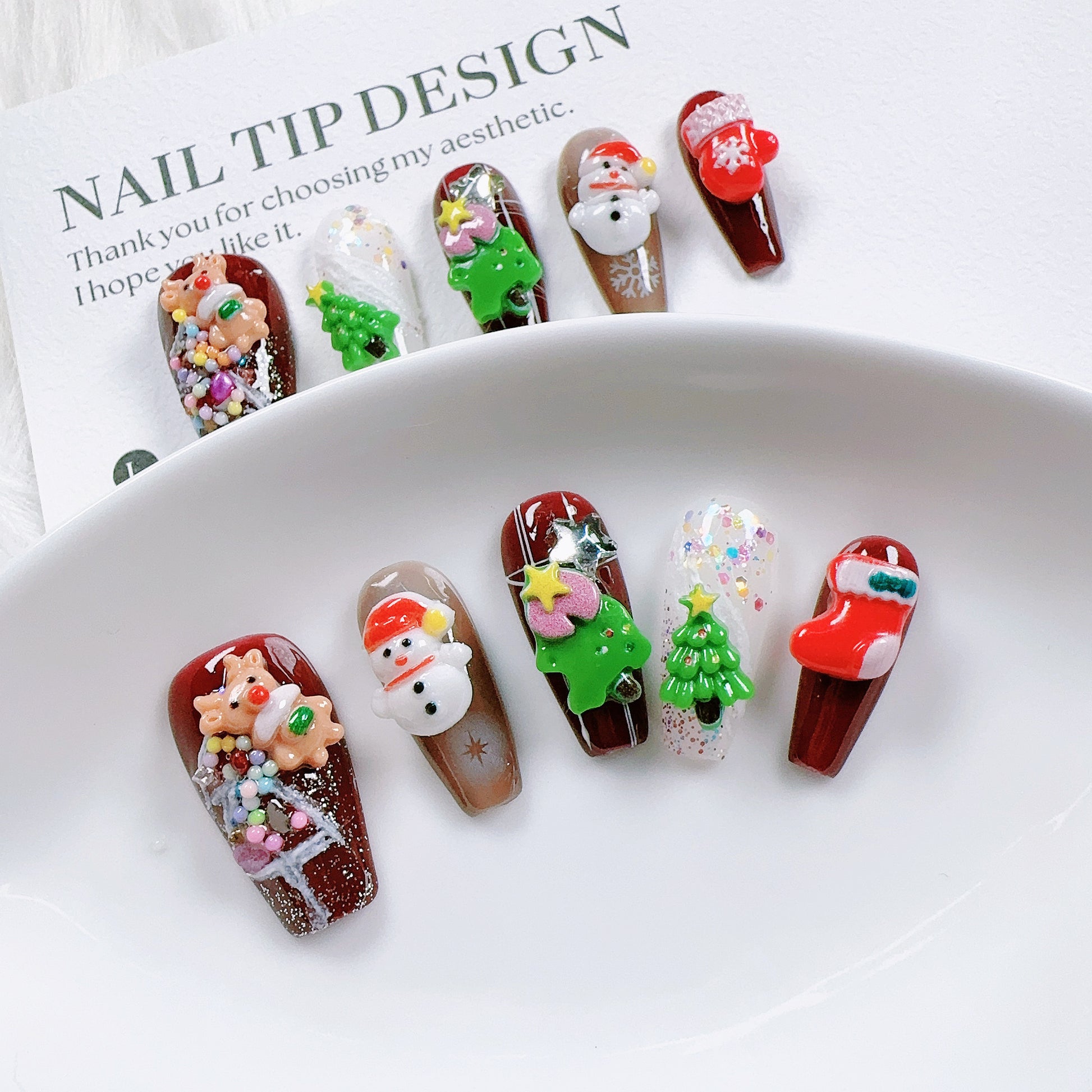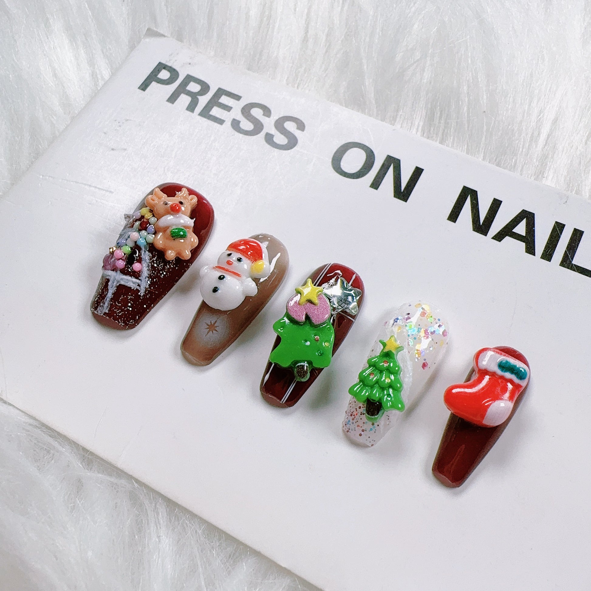 This is an adorable and festive set of handmade Christmas-themed press-on nails, bursting with colorful 3D holiday characters and decorations. The design is playful and joyful, capturing the magic and cheer of Christmas.