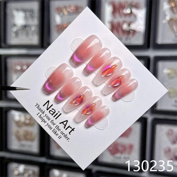 A vibrant and refreshing nail design that channels the playful charm of a summer treat. Each nail features a glossy pink-to-clear gradient, mimicking the cool blush of crushed strawberries. At the center, dazzling iridescent shards are embedded like icy crystals, reflecting fiery hues of orange and violet with every tilt. The jelly-like translucency adds a juicy, hydrating finish perfect for anyone craving a bold yet sweet aesthetic with a fruity twist.