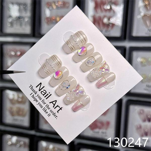 An enchanting nail set that captures the allure of underwater treasures. With a creamy nude base, each nail is adorned with shimmering opalescent accents and iridescent rhinestones that glisten like sunlight on ocean waves. Rows of delicate pearls and a bold butterfly embellishment give the design a whimsical, fantasy-like feel, reminiscent of a mermaid secret trove. The soft pink chrome tips add a polished, modern edge perfect for anyone who dreams in pastel seashell tones.