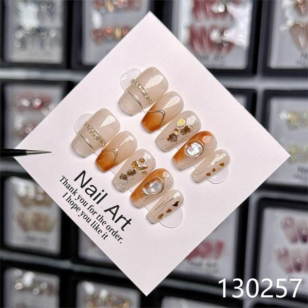 A warm, autumn-inspired nail set that blends elegance with earthy charm. Featuring a gradient of creamy beige to rich amber tones, the design is accentuated by delicate gold foil, fine lines, and embedded maple leaf-like motifs. Subtle 3D embellishments add depth and sparkle, reminiscent of golden leaves caught in sunlight. This set evokes the cozy beauty of fall, making it perfect for those who appreciate seasonal sophistication with a touch of luxury.