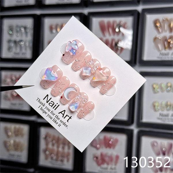 This enchanting nail set captures the dreamy beauty of a starlit evening. With soft pink gradients fading into sparkling glitter, each nail is adorned with celestial 3D accents like shimmering crescent moons, radiant hearts, and iridescent butterflies. Holographic gems and pearlescent details reflect light like stars across a twilight sky, creating a magical, ethereal look that's perfect for those who love a touch of fantasy and moonlit charm.