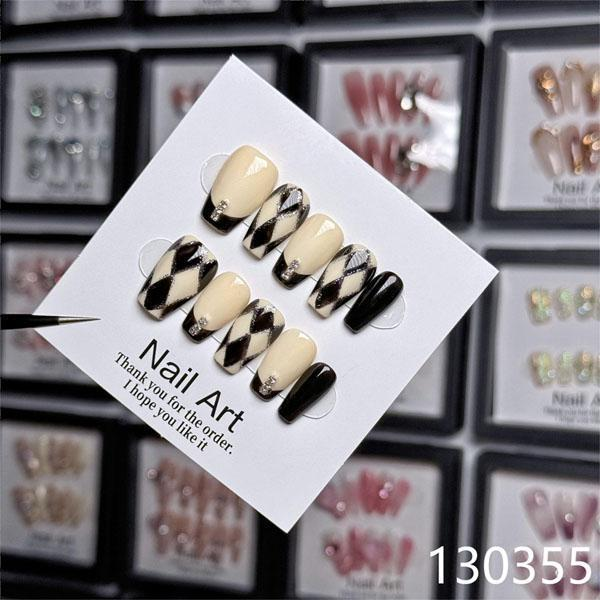 A bold, playful nail set that fuses elegance with statement style. Featuring a sophisticated beige and black palette, this design alternates between solid glossy tips and striking argyle patterns, reminiscent of a stylish masquerade ball or a high-fashion soire. The alternating checkerboard diamond design adds a retro yet edgy flair, perfect for making a chic entrance wherever the fantasy takes you.
