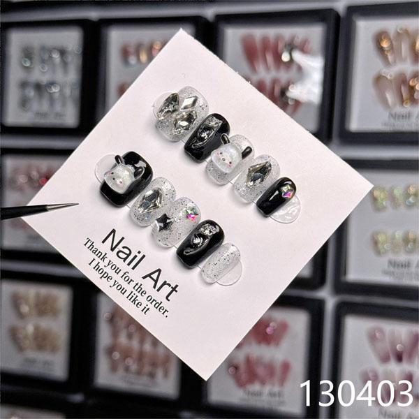 A playful and edgy press-on nail set inspired by the beloved Sanrio character Pochacco. This set combines sparkling silver glitter, holographic gems, and black accents to create a striking, fun-loving look that balances cute and cool.