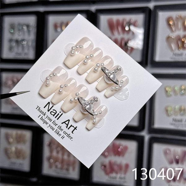 A luxurious, celestial-inspired press-on nail set featuring an elegant cream base adorned with delicate pearls and a statement silver Saturn-like planet charm. This design blends soft femininity with cosmic elegance, perfect for adding a refined sparkle to any outfit.