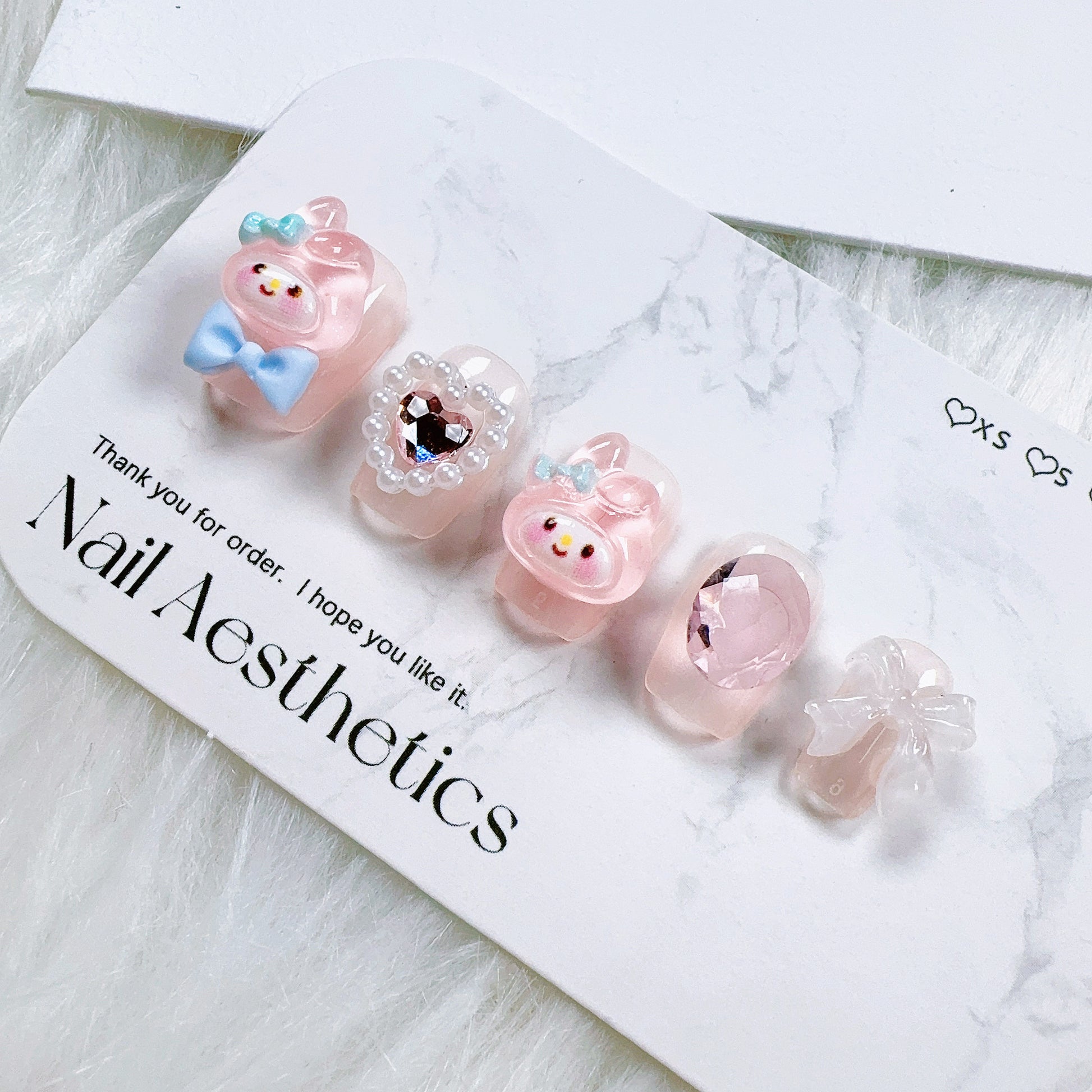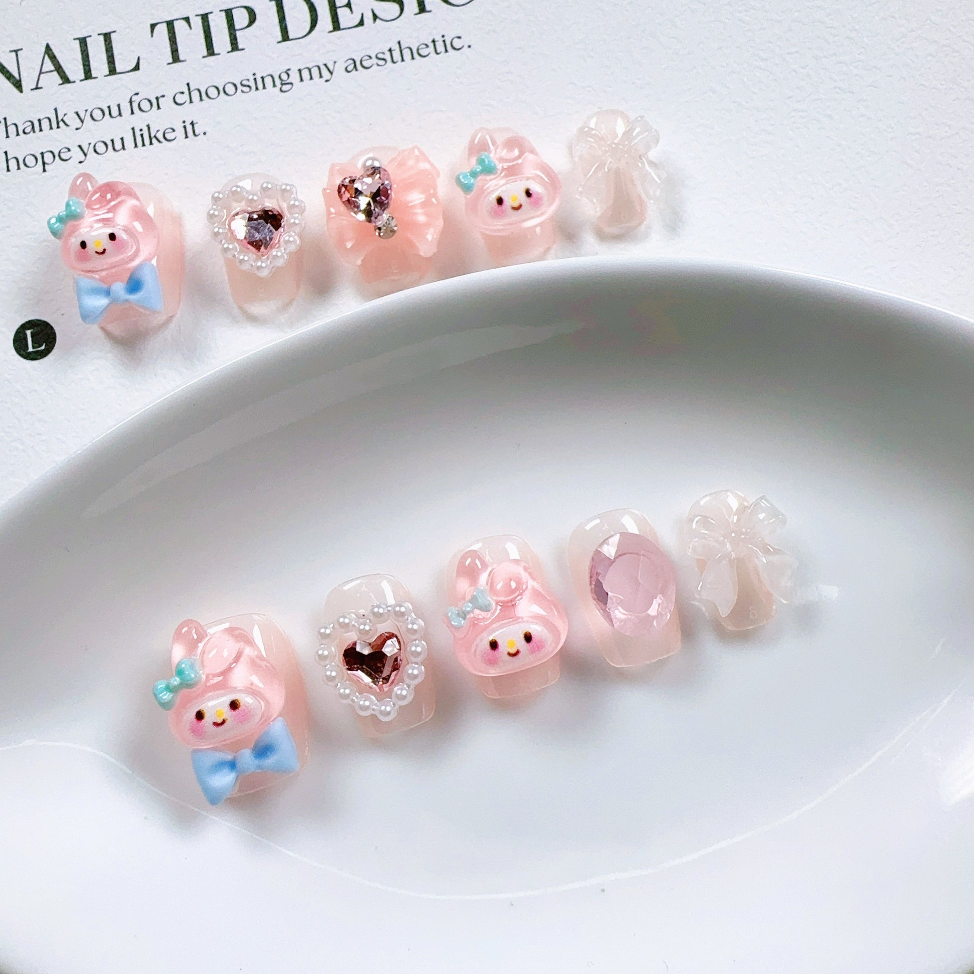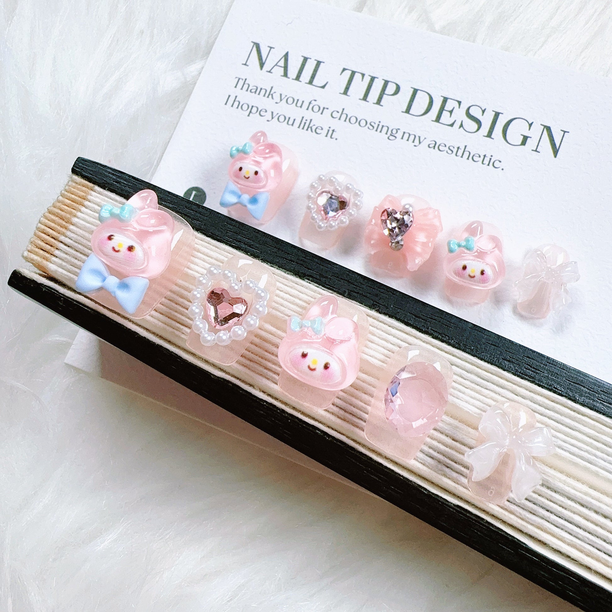A charming 3D nail set inspired by Sanrio¡¯s beloved character My Melody, blending playful cuteness with elegant crystal elements.
