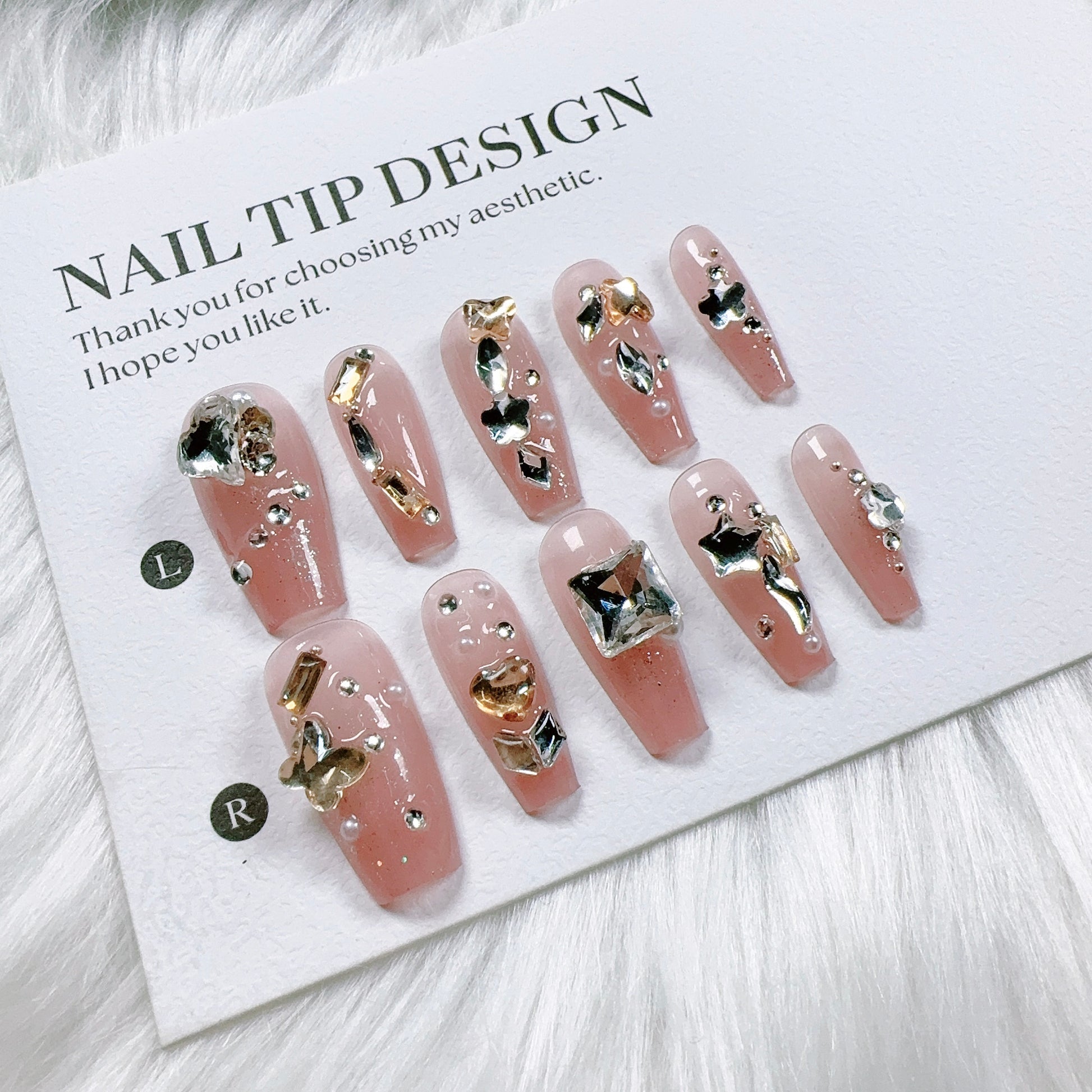 A romantic glam design with chunky gems and crystal-like accents ideal for special occasions or anyone who loves maximalist nail art.