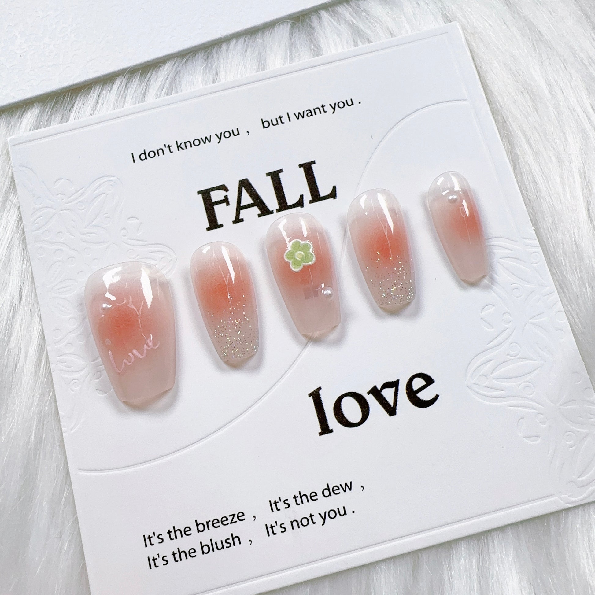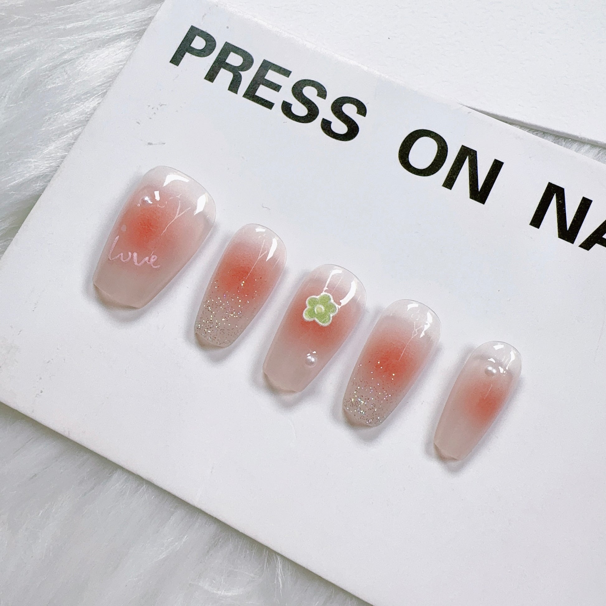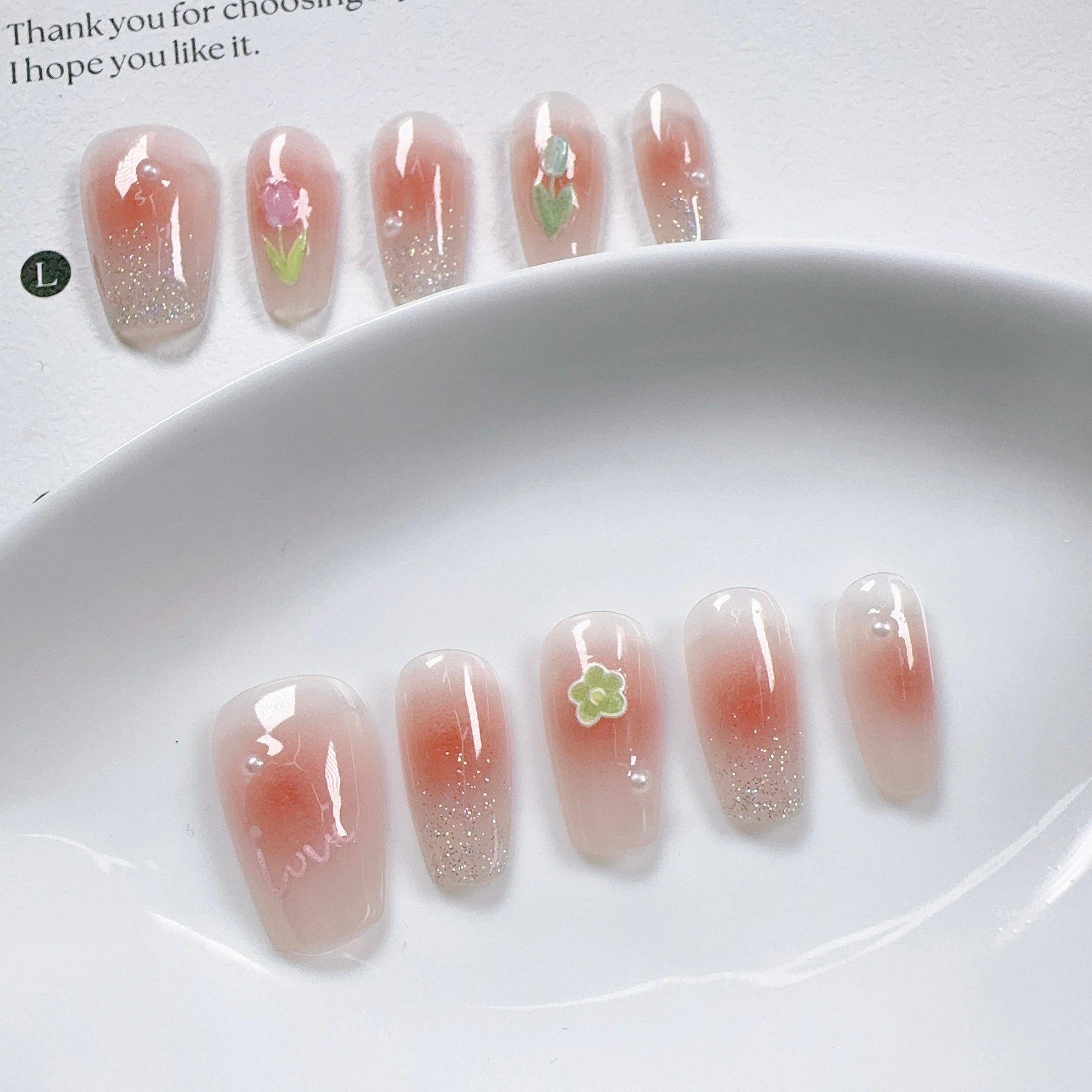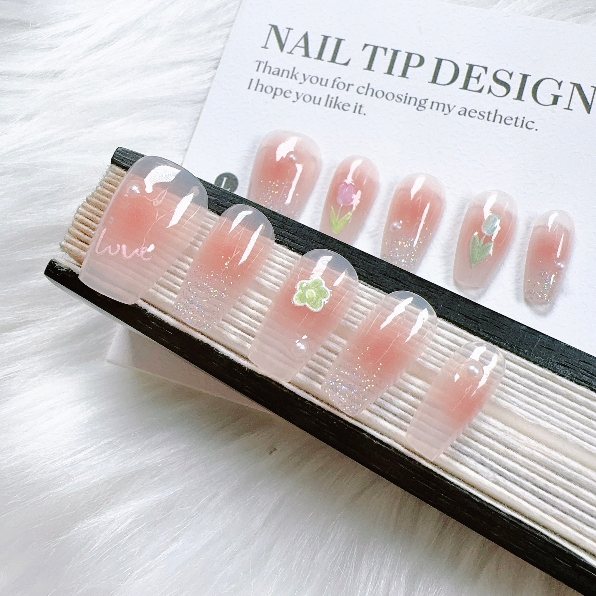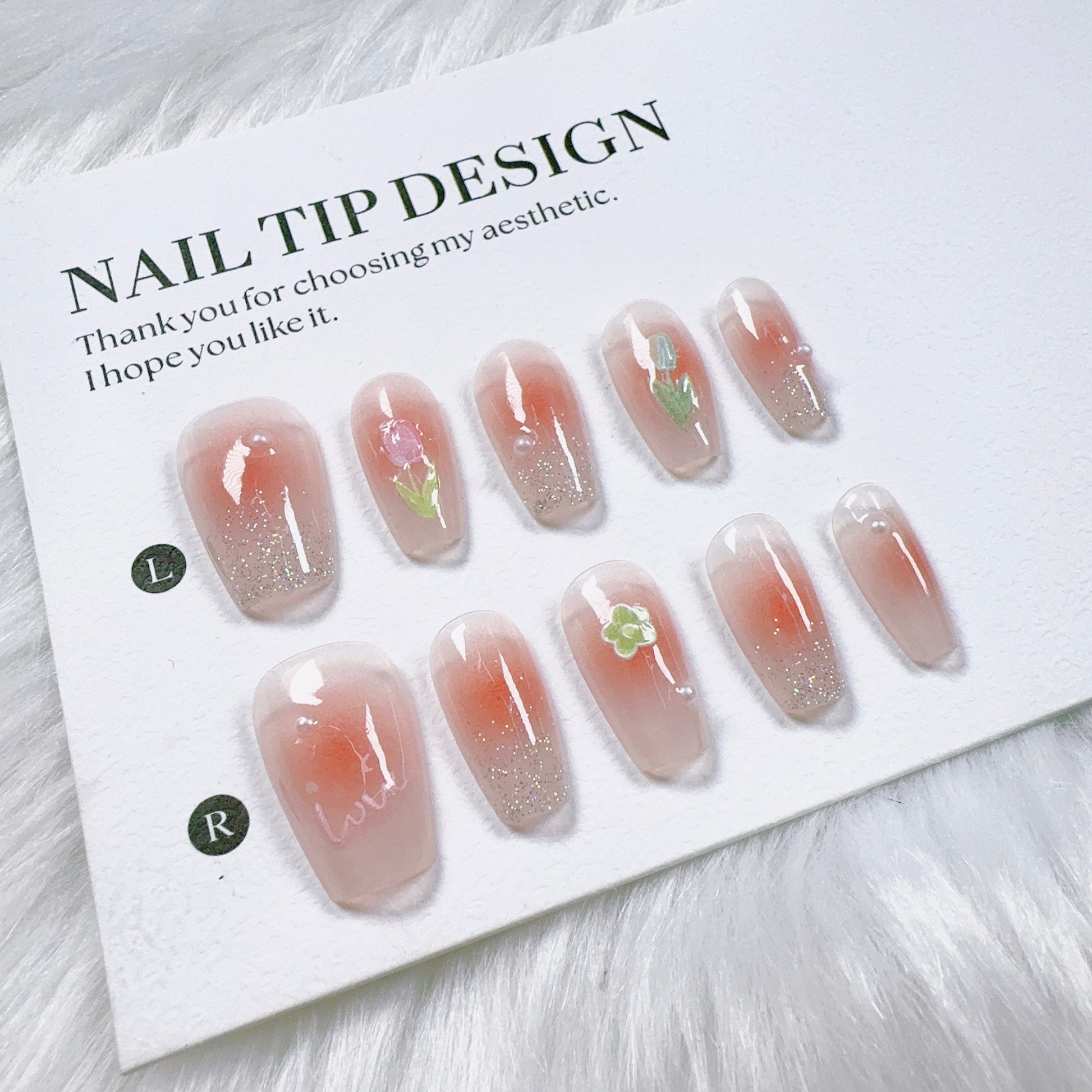 This delicate and romantic press-on nail set is inspired by tulips glowing softly under warm summer sunlight. The design features a smooth peachy-pink ombr that transitions into a milky nude base reminiscent of the soft blush of tulip petals kissed by golden light.